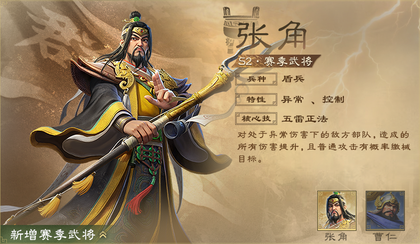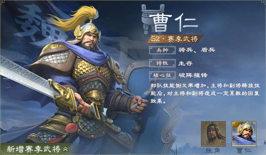二賽季中有曹仁,張角兩名新武將加入戰(zhàn)場(chǎng),各位主公需存儲(chǔ)金銖抽取新武將。