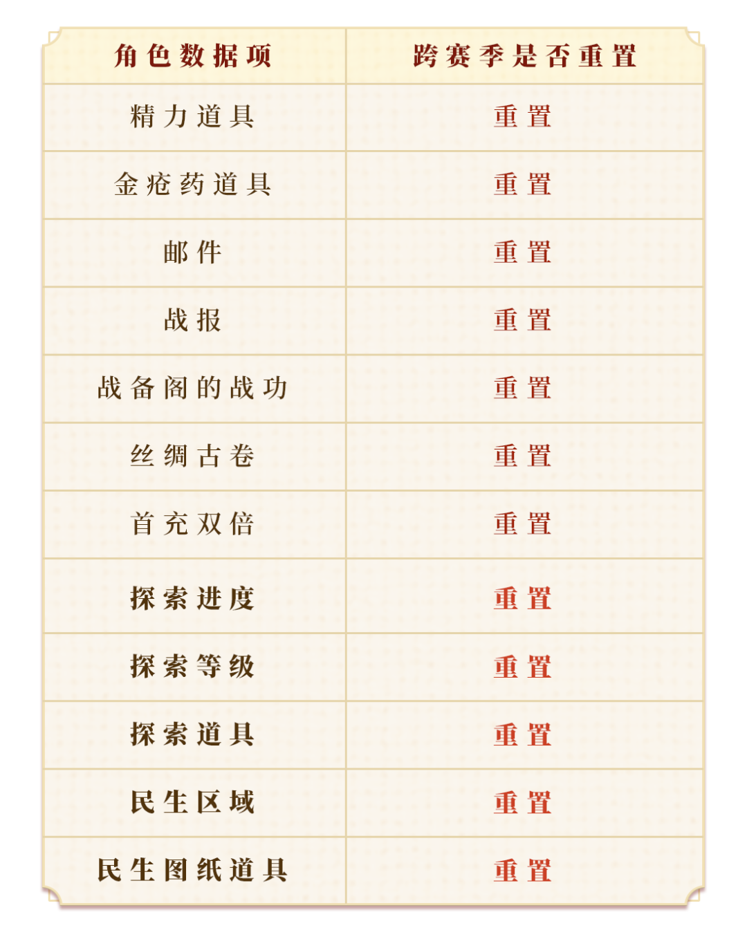 ● 一賽季的大部分內(nèi)容都將保留,僅有民生,探索系統(tǒng)等少量?jī)?nèi)容會(huì)進(jìn)行重置,下圖為會(huì)進(jìn)行重置的數(shù)據(jù)項(xiàng),其他都會(huì)進(jìn)行保留;