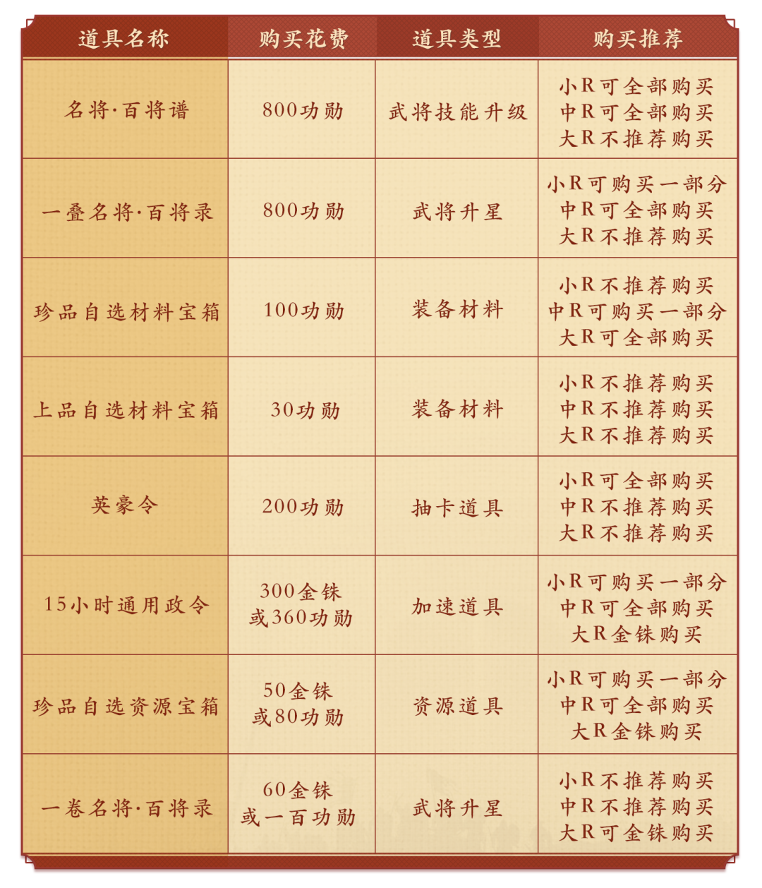 阿武提示:預(yù)算充足的玩家優(yōu)先選擇金銖購(gòu)買加速道具、資源和百將錄。否則可考慮優(yōu)先用功勛購(gòu)買資源以及英豪令哦。