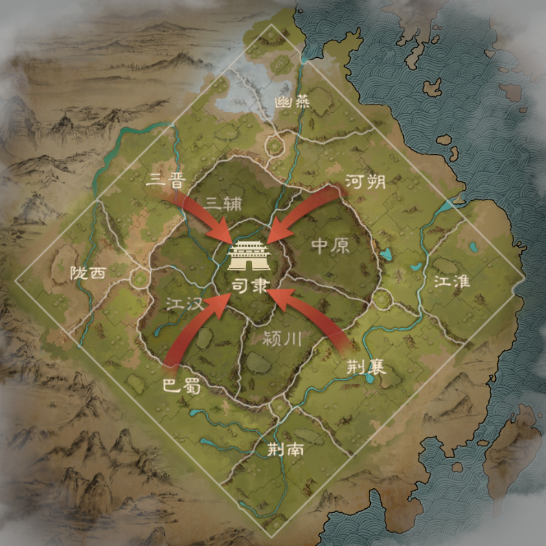 ● 二級(jí)資源州:江漢、潁川、中原、三輔。二級(jí)州擁有更豐富的資源和更高級(jí)的城池,每個(gè)出生州對(duì)應(yīng)一個(gè)資源州。